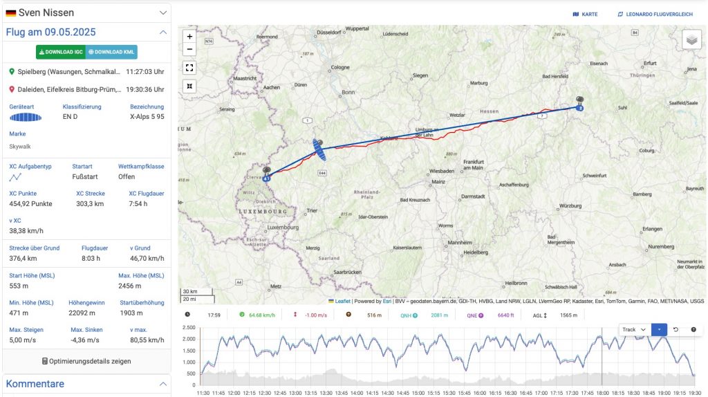 Auch unser Mitglied Sven Nissen entschied sich für ein thüringisches Startgelände, um seinen bisherigen Bestwert von 290,6 km zu übertreffen. Am 9. Mai 2025 gelang ihm vom Spielberg (östlich der Wasserkuppe) ein herausragender Flug über 303,3 km bis nach Daleiden, kurz vor der luxemburgischen Grenze – mit beeindruckenden 7:54 Stunden Airtime. Doch dabei blieb es nicht: Mit einem FAI-Dreieck von unglaublichen 154,9 km legte er eindrucksvoll nach und setzte schließlich mit einem dritten Hammerflug (231,4 km) den Schlusspunkt.