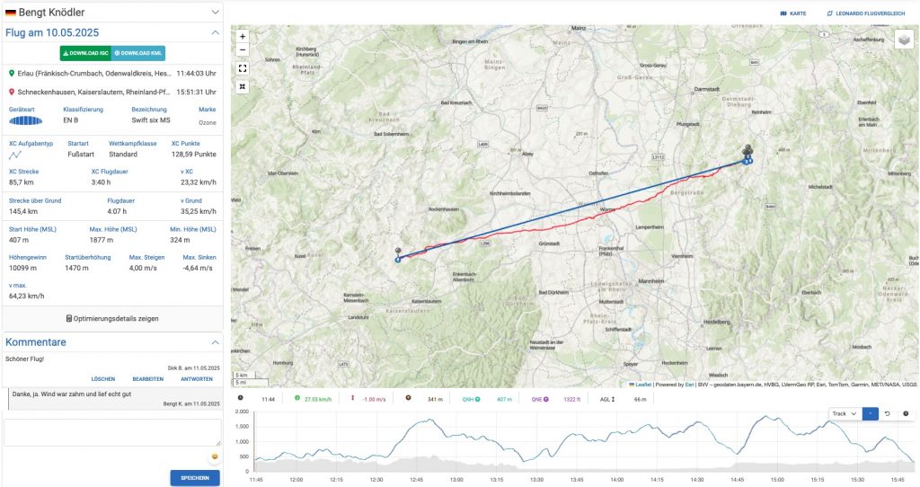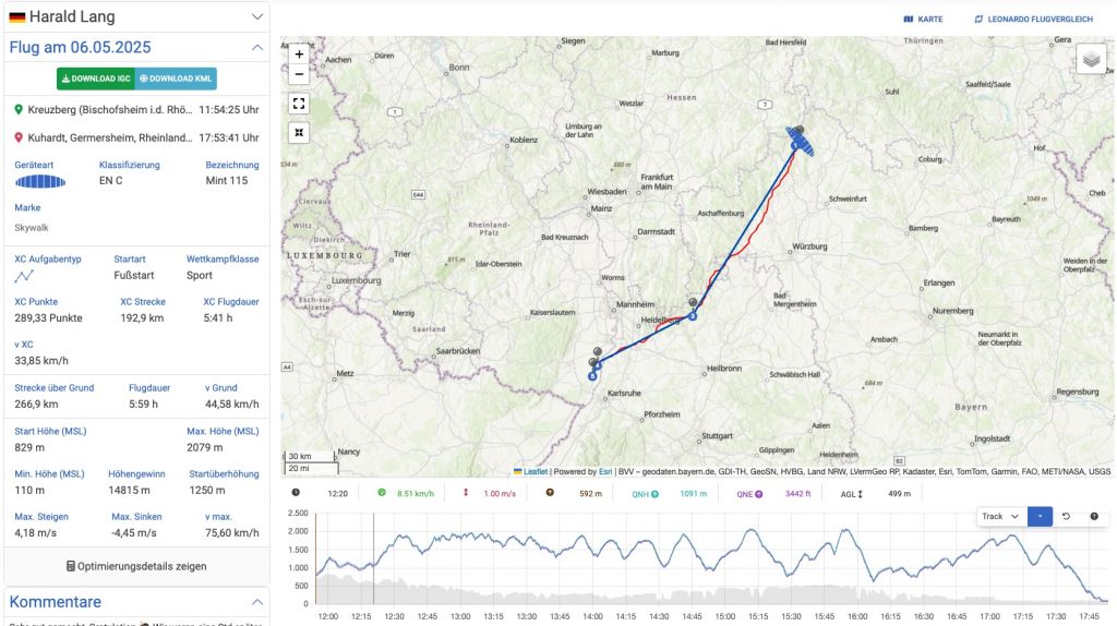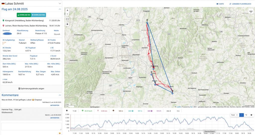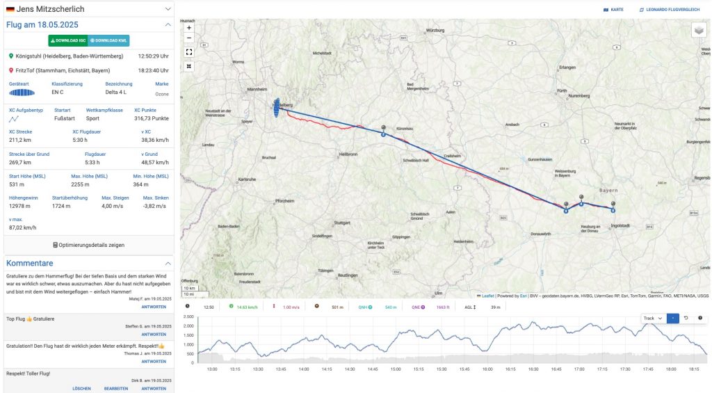 Der Ü-200-Flug unseres Mitglieds Jens Mitzscherlich vom 18.5.2025 ist ebenso eine herausragende Glanzleistung. Mit 211,2 km gelang Jens an diesem Tag der mit großem Abstand weiteste Flug vom Königstuhl in der vergangenen Saison. Jens, der gerne auch mal an den Start geht, während andere noch beobachtend vor Burnair ausharren, hat diese Strecke in 5:33 h absolviert, mit einer Durchschnittsgeschwindigkeit von satten 38,36 km/h. Für einen Ozone Delta Piloten eine sportliche Pace und auch ein Zeichen dafür, dass Jens gerne bei knackigen Bedingungen unterwegs ist und diese, wie häufig schon unter Beweis gestellt, entsprechend nutzt! Mit seiner enormen Chancenverwertung flog er in der letzten Saison auf den ersten Platz des Odenwald Cups! Gratulation zu deinem ersten 200er Flug und dem insgesamt top Saisonergebnis!