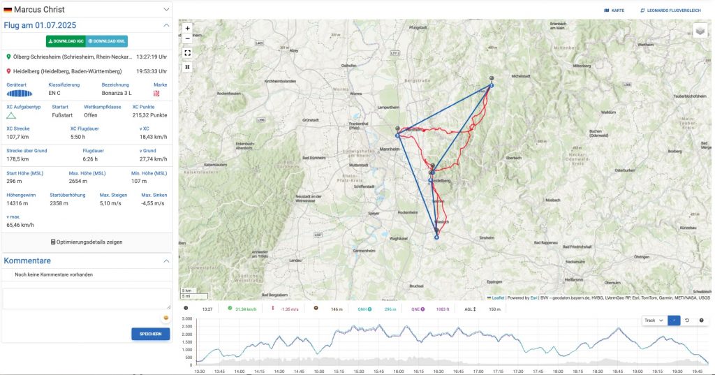 Mit 107,7 km flog er am 1. Juli 2025 auf den ersten Platz der jemals vom Ölberg erzielten FAI-Dreiecke – rund 19 km weiter als das bislang beste Ergebnis. Dreistellige FAIs über dem Odenwald wurden bislang vor allem vom Kö geflogen. Marcus’ Flug könnte somit den Beginn einer neuen Ära markieren.