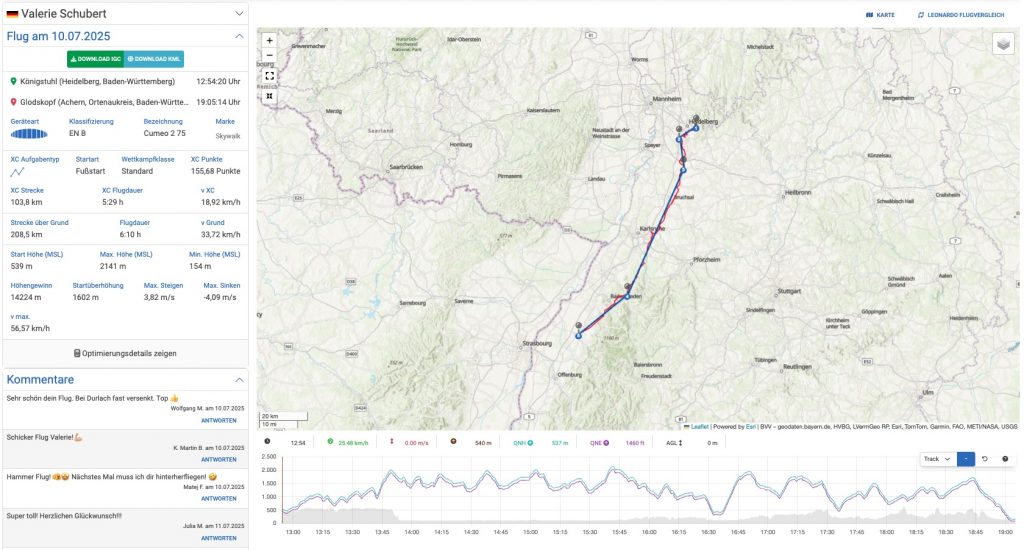 Neben den Flügen die es in die Top-Rankings schafften, sind vor allem auch Ergebnisse erwähnenswert die persönlichen Bestleistungen von Mitgliedern markieren, deren Namen nicht ständig ganz oben in den Wertungslisten stehen. Der erste Ü100-Flug von Mr. Fly wurde vor diesem Hintergrund bereits weiter oben erwähnt. Eine tolle fliegerische Leistung hat auch Simon Wilke hingezaubert, als er am 30.4.2025 ein 85,9 km flaches Dreieck vom Königstuhl flog – gerademal 2,2 km weniger als Harald Lang an diesem Tag gelang – und das mit einem B-Schirm! Respekt! Bengt Knödler fiel mit einem schönen Flug von Erlau auf, der ihn 85,7 km in westlicher Richtung nach Schneckenhausen, nördlich von Kaiserslautern, beförderte. Auch diese Strecke wurde mit einem B-Schirm (Ozone Swift 6) absolviert. Laut DHV-XC sein bislang weitester Flug von einem Odenwaldrunde-Startplatz. Herzlichen Glückwunsch! Unter den Pilotinnen konnte erneut Valerie Schubert überzeugen. Mit 103,8 km freier Strecke vom Königstuhl absolvierte sie mit ihrem Skywalk Cumeo am 19.7. von dort den weitesten Flug des Tages. Gratulation!
